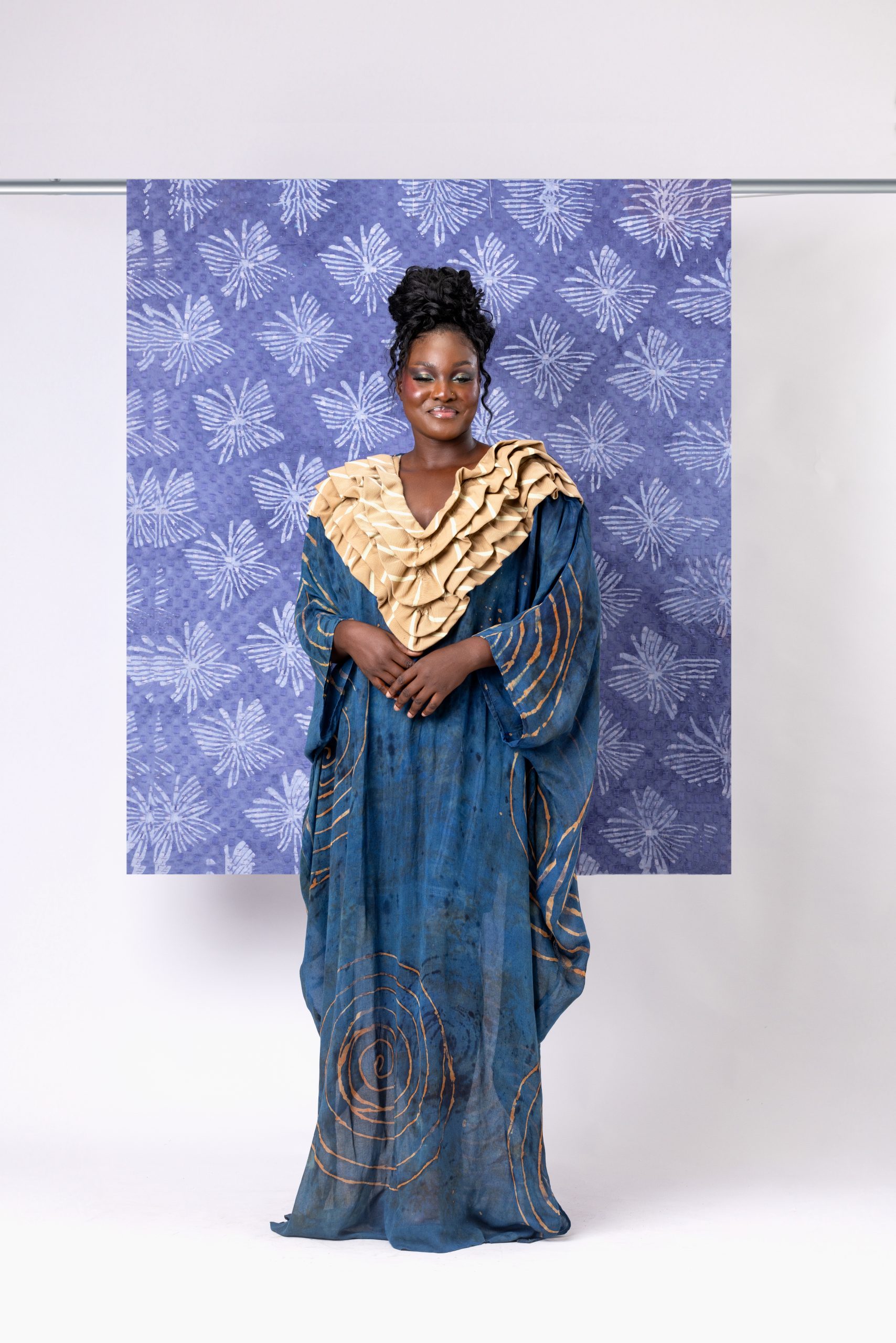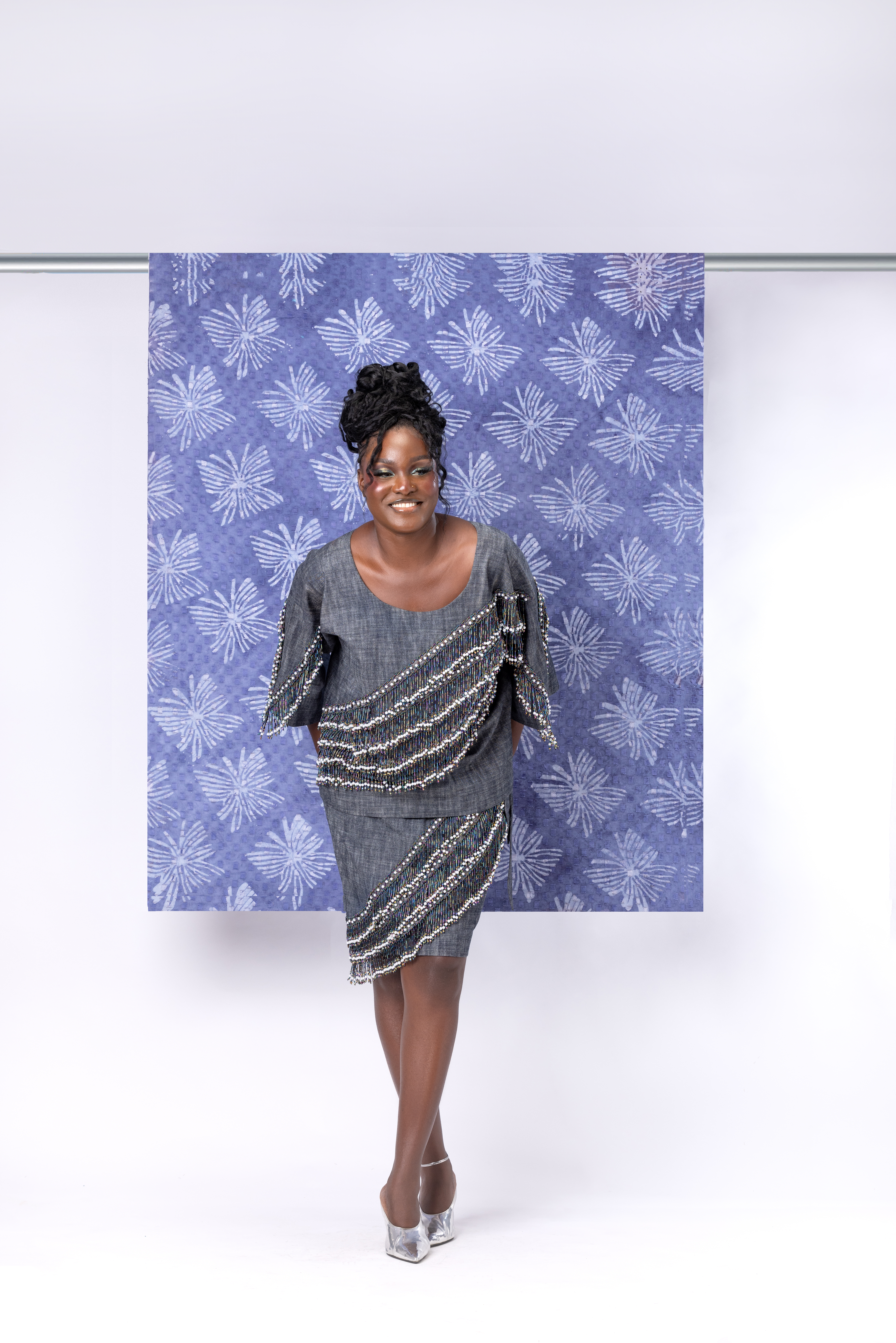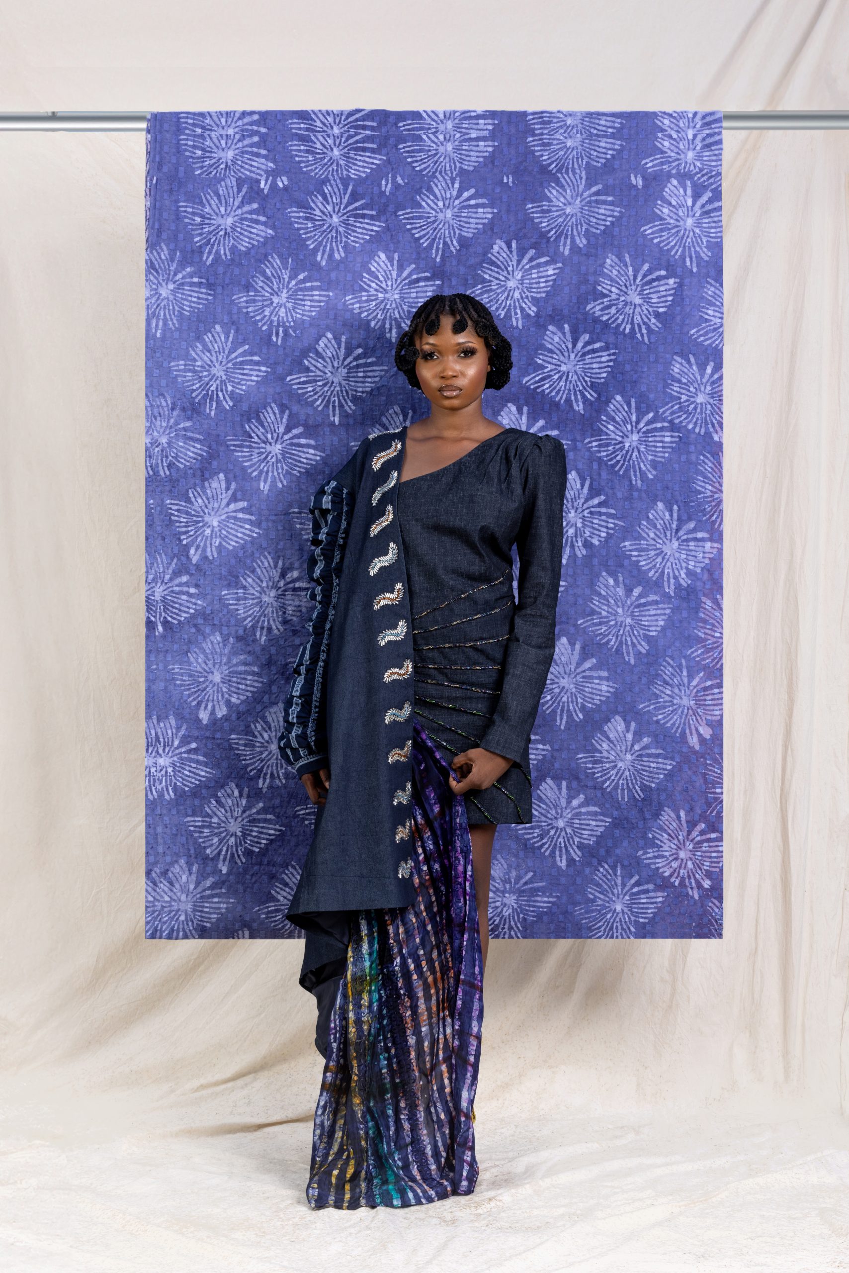 This drop is Heavily denim-focused. The use of different variations of premium denim, infused with a mix of ASO-OKE, Adire, and colorful fabrics, as well as a unique placement of ruffles, Pearls, crystals, and local Cowrie shells, strategically hand beaded into the fabrics to bring to life the Vibrancy and Cultural richness Hauwa De Zuzu has become known for.