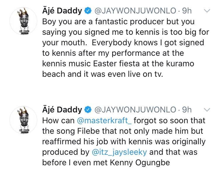 A little while later, Jaywon then engaged in a four-tweet rant, “How can @masterkraft_forget so soon that the song ‘Filebe’ that not only made him but reaffirmed his job with Kennis was originally produced by @itz_jaysleeky (Jay Sleek) and that was before I even met Kenny Ogungbe.