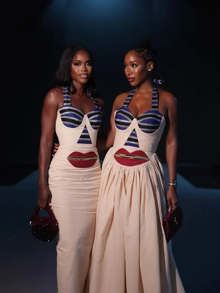 Their corset tops featured bold geometric cutouts and surrealist, face-inspired details. The striped blue panels and red lips at the midsection looked like a playful twist. Chi stunned in a fitted column dress, while Enigiven turned heads in a voluminous skirt version.